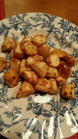 将锅中油倒出,不用刷过,放入糖和水,大火熬糖(大泡变小泡,小泡变金黄,然后变成浅褐色的时候倒入炸好的山药)装盘