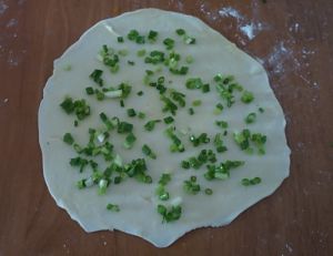 此时油温下降,可以用汤匙在饼坯上抹葱油了