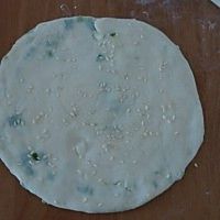 再擀成圆饼,上面撒芝麻,不撒也可以,但是撒了的话要亚实了,因为你不压实了,会乱跑,乱跑就会煎的时候糊,容易糊的话就会影响成本,