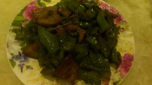 先放肉片炒至金黄色然后再放入切好的配料翻炒至熟,放入少许的盐和味精