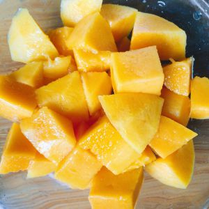 芒果压成泥。如果量多可以留一些切成小块做装饰。