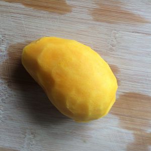 将芒果去皮,同时准备一碗开水放凉备用。