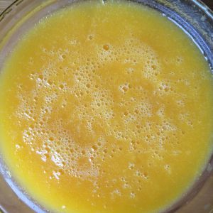 芒果留少许果肉切丁,其余用搅拌机打成泥,倒入放凉后的奶油糊中,搅拌均匀