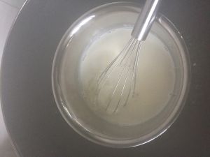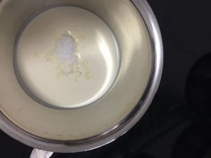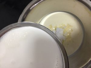 加热牛奶,温度大约70度左右,加入白糖。