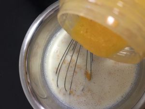 牛奶凉后加入淡奶油和芒果泥拌匀。