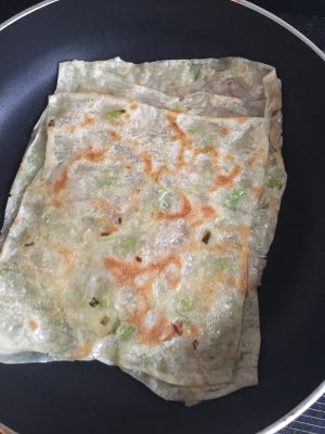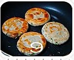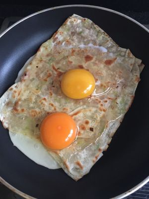 这时您可以打上鸡蛋在一面饼上,这都随您喜好啦,煎熟后起锅切块。