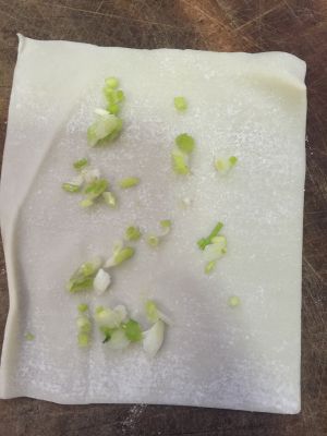 取一份面团,擀成薄饼状,抹上一层葱油,撒少许盐,再铺一层葱花。
