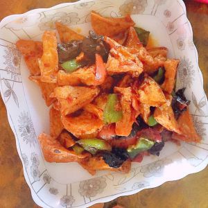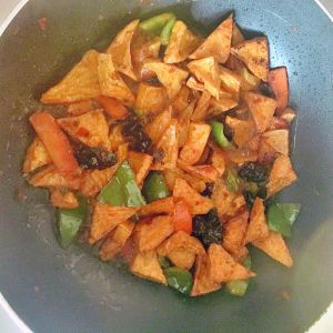 先倒入蔬菜翻炒,快要变软之后倒入煎好的豆腐,开始翻炒