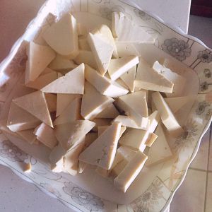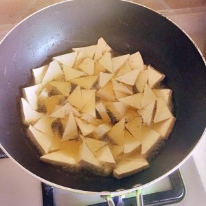 豆腐切厚片在电饼铛里面煎一下,煎至两面金黄就可以了,可以稍微撒点盐(如果感觉技术好也可以在炒锅里面直接煎,我主要技术不过关,所以提前煎好)