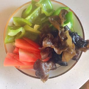 青椒切菱形片,木耳提前泡发,蒜切片备用