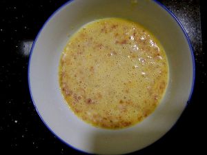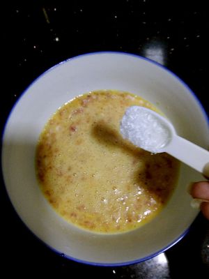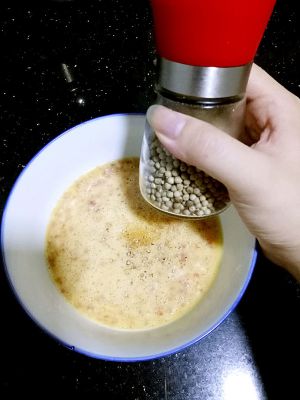 肉沫打好后加入味精。(在这里如果家里有鸡粉的同学可以加些鸡粉,味道会更好。)
