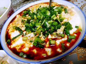 起油锅,加入豆瓣酱和香葱爆香,先加入胡萝卜,翻炒几下,再加入豆腐翻炒,倒入适量水把豆腐稍微炖一下,最后放入油菜。加入生抽、糖、十三香适量,出锅前倒入一勺香油