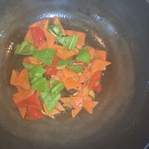 配菜下去炒,这时可调大火,翻炒3分钟,加入豆腐一起翻炒,然后加入些许水,盐,依个人口味放点胡椒都可,焖2分钟就可起锅