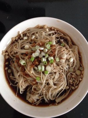 将炒好的调料倒入之前待用的金针菇中,最后放入葱花点缀~