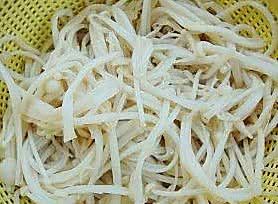 金针菇切去根部,散开,放入沸水中焯熟(30秒内完成,不要焯得过了),过凉控干挤一下水分备用;