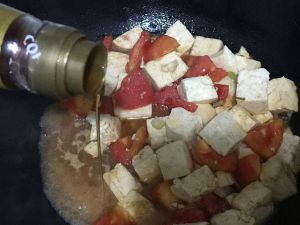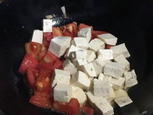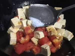倒入剩下的西红柿(提鲜)及煎好的豆腐,葱段放少量的盐巴。