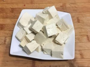 豆腐切块备用(对豆腐涩味敏感的人可以焯水1分钟)