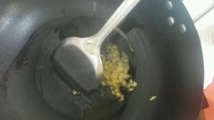 油锅热至八成,倒入葱姜辣椒,煸炒出香味