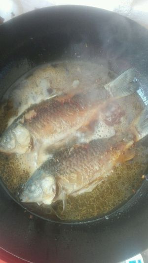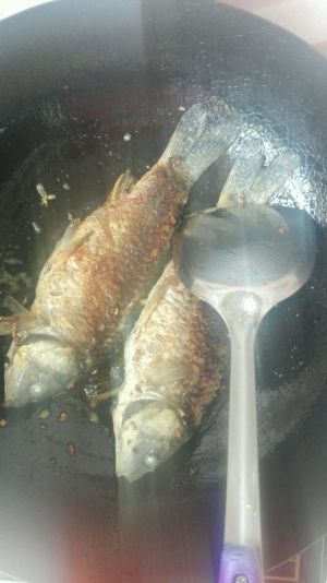炸香后放入自己处理好的鲫鱼哟,,记住没有煎好的话一定不要翻身哟,不然皮就全没了,还容易碎