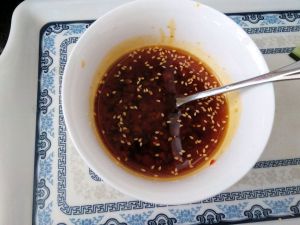 最后加入蒜泥,葱花和芝麻,放在最表层,另起锅烧热,加入少许油(大概就是5汤匙,汤匙为一般家中吃汤圆喝粥用的)烧热后浇在蒜泥葱花上,香味四起,拌一下即可…… 注意:因为是猪肉,所以尽量热的时候吃,避免油凝固影响口感