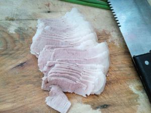 煮好的肉肉捞出,放至不烫手,切薄片(切菜刀最好锋利些哦)
