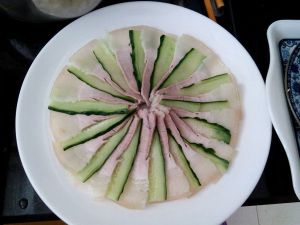 五花肉洗净 焯下去血沫,再捞出和葱姜蒜 料酒一起中火煮20分钟,再关火焖10分钟,再冷开水泡凉后冷藏10分钟。最后切片。黄瓜冷藏会切片。和白肉一起摆盘。