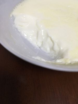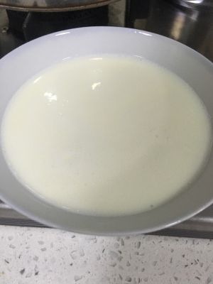 蛋奶倒入有豁口的杯子里,慢慢倒到碗里,奶皮还浮在表面