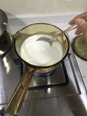 淡奶油,牛奶,炼乳倒入奶锅中,心火加热并搅拌均匀,直到微微冒泡即可关火