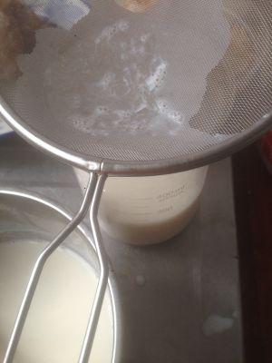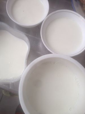 放凉的奶上,会有一层奶皮,从一个边边上拉开一个小口,缓缓把牛奶倒出(碗底留一点牛奶,防止皮粘到碗底)