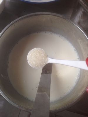 将牛奶与蛋清混合加入适当的砂糖。牛奶与鸡蛋比例500ml的牛奶用3个鸡蛋。