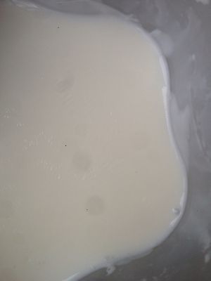 将蛋白液和牛奶搅匀,再沿着牛奶碗的边缘缓缓地倒回牛奶碗中,一定要慢,慢到你能看到奶皮慢慢地出现在混合液上。