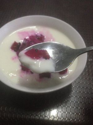 蛋清和牛奶混合搅拌均匀倒回有奶皮的碗中。微波炉2分钟后看一下没有凝固继续中高火2分钟,结束后加入喜欢吃的水果或干果。
