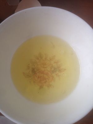 用一个勺子在凉好牛奶的边缘插个小洞(注意别破坏奶皮哦)。沿着小洞缓慢地将牛奶倒入蛋白液中。(这一步要非常小心啦,手势很重要,领会也很重要,要知道为什么要这样做,这样做的目的是什么。)此时牛奶碗里面只剩下奶皮了,放着,别动它。