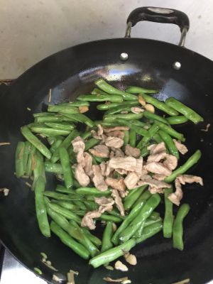 加入炒好的肉丝,和四季豆一起翻炒,加入适量的生抽