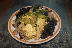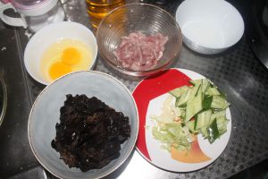 把炒好的鸡蛋装盘备用,锅里加点油,放入肉片炒熟,加入葱姜蒜酱油翻炒,倒入木耳、黄花菜、黄瓜、鸡蛋翻炒。