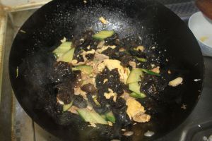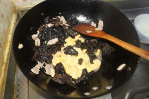 炒好肉片后加入木耳和鸡蛋大火快炒。