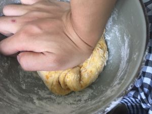 把面揉好的面团切成均等的小面团,每一个捏成底部薄两边较厚的窝放入豆沙再包起来