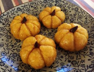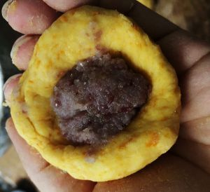 将南瓜泥分成等量小份,将馅加入南瓜泥中,揉成园饼状,滚上干糯米粉