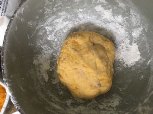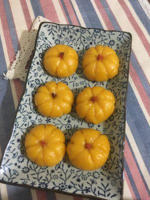 先将南瓜蒸熟,搅成泥,然后将糯米粉、牛奶、面粉、白砂糖加入混匀