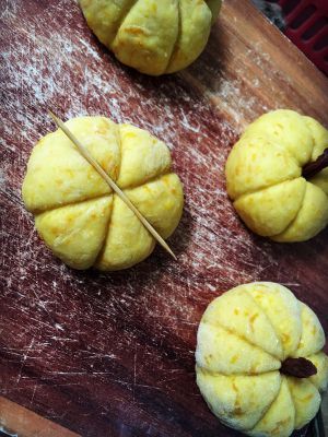 用牙签或者是小刀压出南瓜的纹路,先打个叉再在叉中间压一横即可,用枸杞或者葡萄干做柄