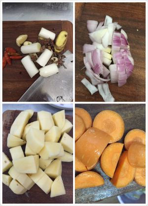 准备好,花椒,泡椒(干辣椒也行的),姜,蒜,葱段,香叶,土豆去皮切块,红萝卜切块,洋葱切丁备用