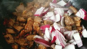 等到土豆肉炖烂加入洋葱翻炒加盐调味