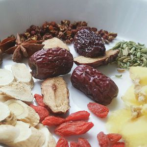 牛肉上色后,放入洋葱,将洋葱炒至变软、发黄,加入温水、红枣、黄芪、枸杞。小火闷煮一小时左右。