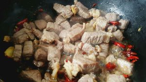 热火起油,倒入调料 (七星椒、小茴香、姜片、八角、花椒、胡椒粉) 炒香后,倒入牛肉继续翻炒至牛肉脱水,加入料酒、耗油。