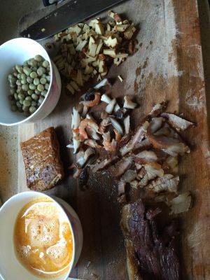 准备所有材料,冰箱里能放的脚料都放起来。炒饭的时候放点黄酒增香,酱油增色