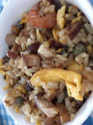配料炒好要盛出来,再炒米(炒米时打里一个鸡蛋,这样炒米时不粘锅,出来的米比较散)