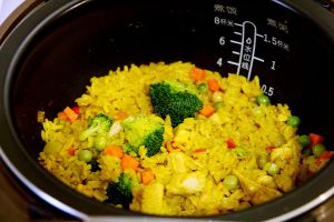 当健跳至闷饭过程时打开盖,加入西兰花再煮至保温2分钟拌匀便可出锅