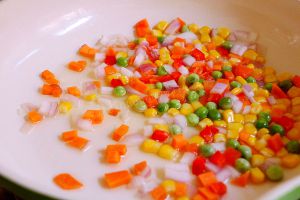 锅中倒油,加热后倒入玉米、豌豆、萝卜、红椒及洋葱粒翻炒至香。