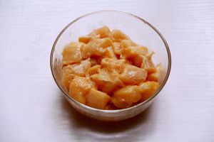 鸡腿去骨后约有250g鸡肉,切小块状,拌入蒜蓉、植物油、2g盐、料酒、酱油和淀粉搅拌均匀,腌制10min