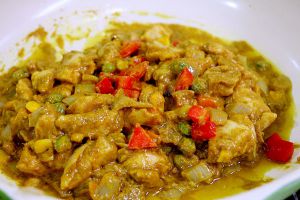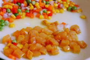 将玉米、豌豆、萝卜、红椒及洋葱粒拔至一边,倒入鸡丁翻炒。